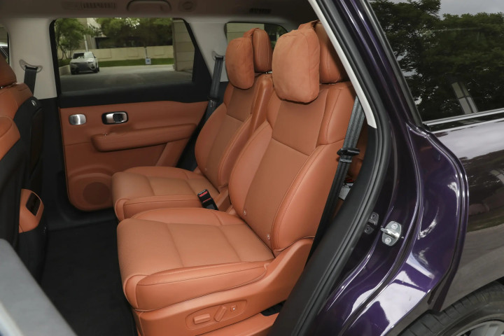 一直都担心第3排的空间可能会拥挤,官方的数据显示第3排的腿部空间达到780mm,头部有940mm。我老婆身高1米65,坐进去之后膝盖和前排大概有一拳左右,完全不会顶头。儿子在放学之后坐第3排可以把书包直接放在侧面的储物袋,还可以打开第2排的小桌板写作业。储物空间的设计还是比较让人惊喜的,门板储物槽这边就算放两瓶1.5升的矿泉水也没有什么问题。中央扶手箱还会分上下两层,所以实用性这一方面确实比较出色。